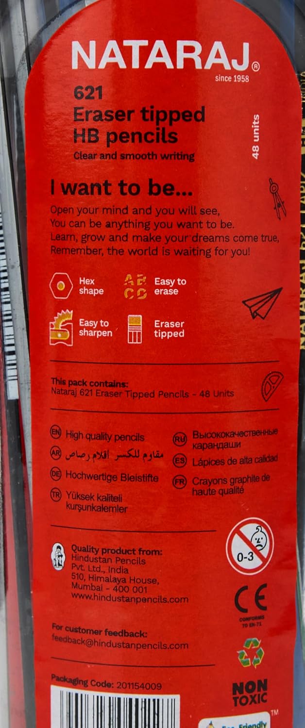 The Nataraj 621 HB Hex Pencil 48-Pieces set in assorted colors offers a versatile and reliable solution for all your writing and drawing needs. These pencils feature high-quality HB lead that ensures smooth writing and consistent performance. The hexagonal shape provides a comfortable grip and prevents the pencils from rolling off your workspace. With durable construction, these pencils are designed for long-lasting use in school, office or home settings. Ideal for writing, drawing and general-purpose tasks, this set of 48 pencils is a practical addition to any stationery collection.