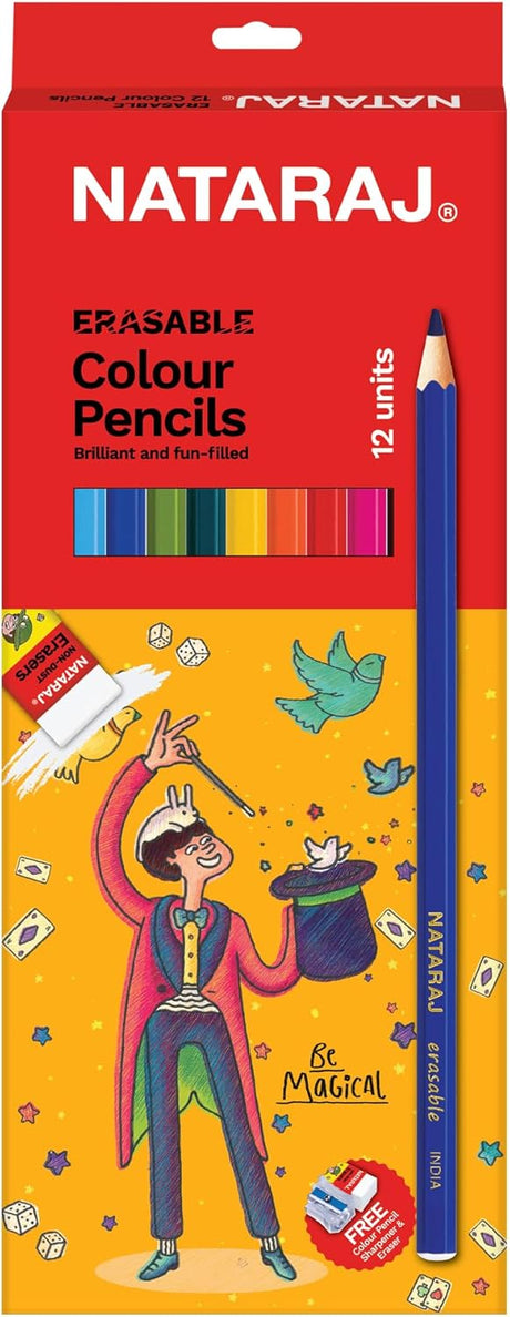 Nataraj Erasable Colour Pencils – 12 Full-Size Multicolor Shades with Erasers